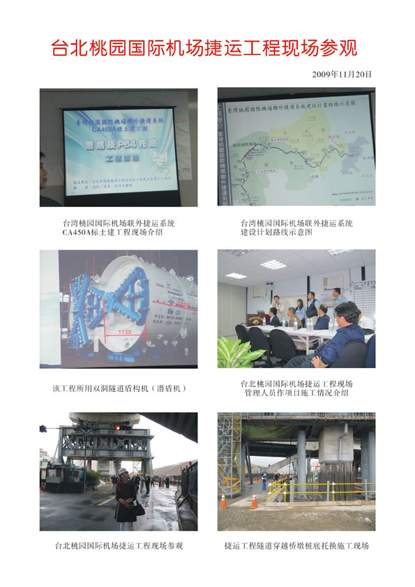 會議收錄了交通、隧道與地下工程等方面之調(diào)查、規(guī)劃、設計、分析研究、施工、管理、監(jiān)測、檢測、環(huán)境保護,隧道與地下工程運營、防災、工程實例介紹以及展望等方面的文章共100多篇。進行了為期兩天的學術報告和學術交流。會議安排了3個專題報告和50個學術報告。會后組織與會代表們參觀了施工中的桃園國際機場聯(lián)外捷運系統(tǒng)(至臺北站)工程。