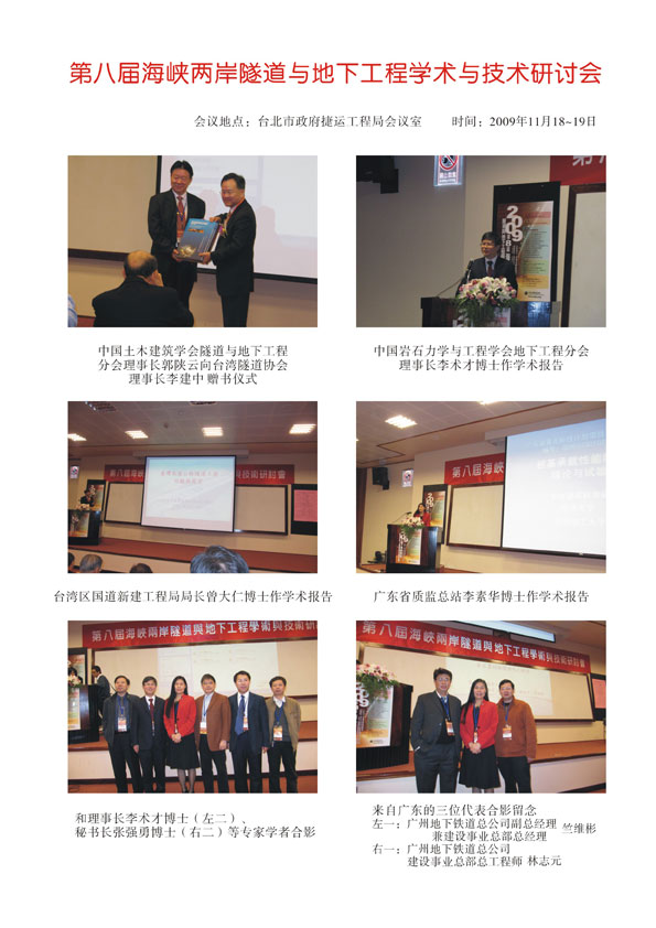 瀏覽次數(shù):1582第八屆海峽兩岸隧道與地下工程學術與技術研討會于2009年11月17日至20日在中國臺灣臺北市政府捷運工程局隆重召開,會議的宗旨是對大陸和臺灣近年來隧道與地下工程的調(diào)查、規(guī)劃、設計、研究、施工、管理、監(jiān)測、檢測、災害防治、風險控制、環(huán)境保護等方面的新技術及最新研究成果進行展示和交流,對存在的相關問題進行探討,以促進全國隧道與地下工程學術與技術水平的提高,加強海峽兩岸學術和技術交流。會議由中國巖石力學與工程學會地下工程分會、中國土木工程學會隧道與地下工程分會和臺灣隧道協(xié)會聯(lián)合主辦,財政法人中興工程顧問社承辦,由臺灣交通部高速鐵路工程局、臺北市政府捷運工程局、交通部臺灣區(qū)國道新建工程局等22家單位協(xié)辦。