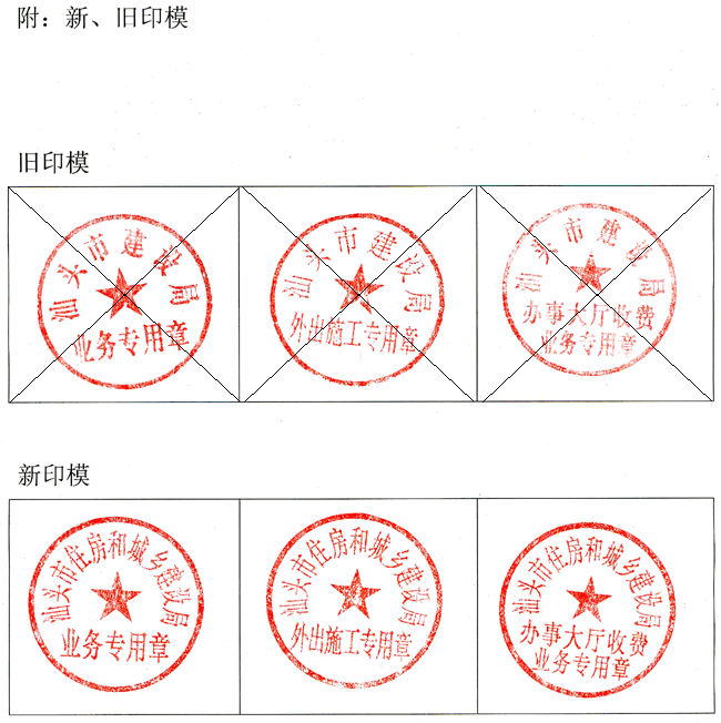 根據(jù)中共汕頭市委、汕頭市人民政府《關(guān)于印發(fā)〈汕頭市人民政府機構(gòu)改革方案〉的通知》(汕發(fā)〔2009〕14號)精神,我市組建汕頭市住房和城鄉(xiāng)建設(shè)局。我局駐市行政服務(wù)中心窗口的相關(guān)新印章“汕頭市住房和城鄉(xiāng)建設(shè)局業(yè)務(wù)專用章”、“汕頭市住房和城鄉(xiāng)建設(shè)局外出施工專用章”、“汕頭市住房和城鄉(xiāng)建設(shè)局辦事大廳收費業(yè)務(wù)專用章”,從即日起啟用,舊業(yè)務(wù)印章同時停用。