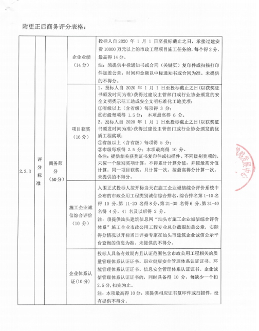 更正為:第三章 評(píng)標(biāo)辦法(綜合評(píng)分法)評(píng)標(biāo)辦法前附表 第2.2.3(1)商務(wù)部分 企業(yè)業(yè)績(jī)(14分)“投標(biāo)人自2020 年 1 月 1 日至投標(biāo)截止之日,承接過建安費(fèi)10000萬元以上的市政工程項(xiàng)目施工任務(wù)的,每個(gè)得2分,最高得14分。注:須提供中標(biāo)通知書或合同(關(guān)鍵頁(yè))復(fù)印件或掃描打印件加蓋公章,時(shí)間和金額以中標(biāo)通知書或合同為準(zhǔn)。未提供的不得分。”